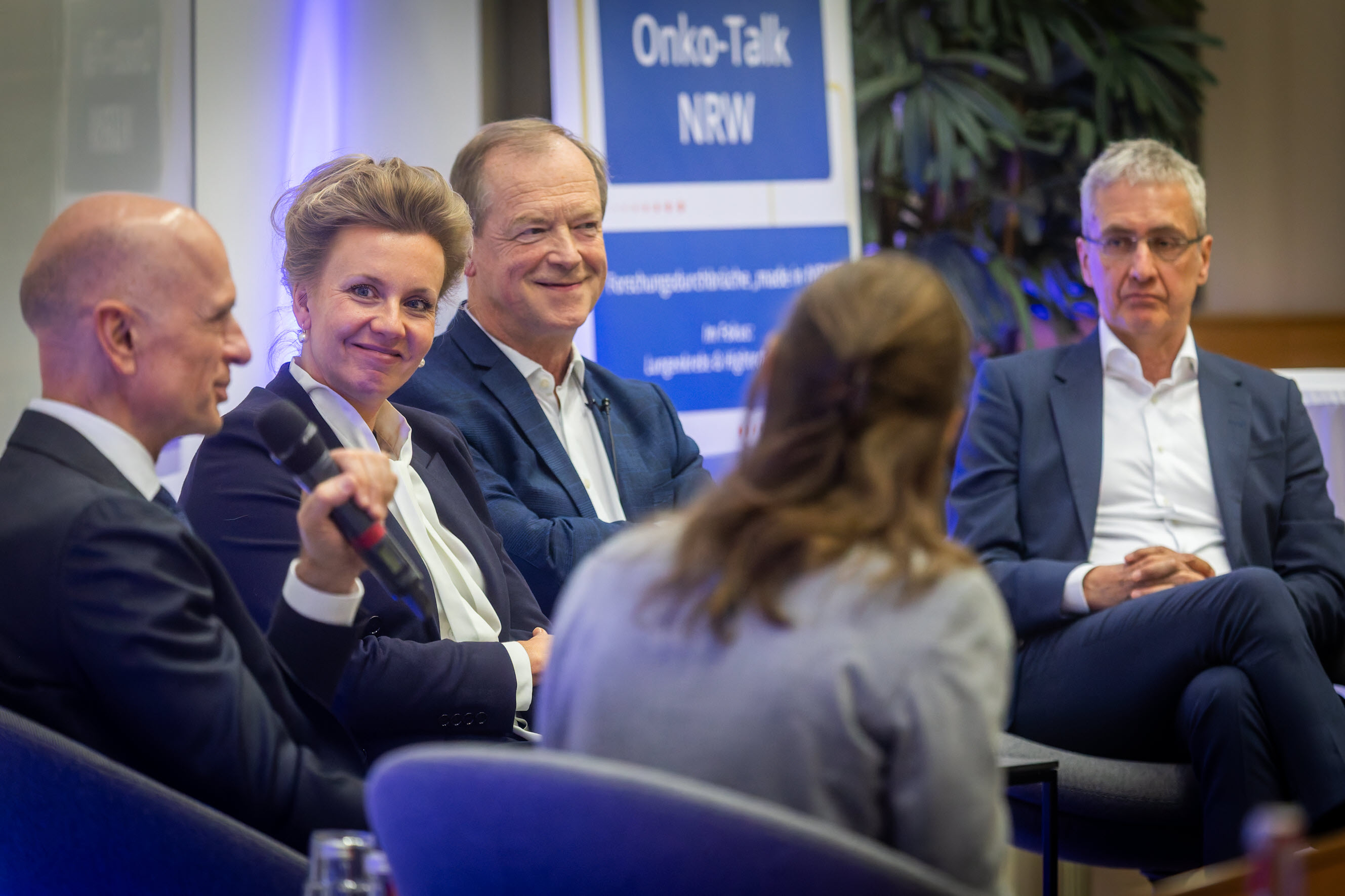 Im ersten Podium diskutierten die nordrhein-westfälische Ministerin für Kultur und Wissenschaft, Ina Brandes MdL, Prof. Martin Schuler (stellv. Direktor WTZ Essen), Prof. Michael Hallek (Direktor CIO Köln) und Prof. Jürgen Wolf (CIO Köln, Sprecher nNGM) die Fortschritte der vergangenen Jahre – und machten deutlich, wie sehr sich die Perspektive für Patientinnen und Patienten verändert hat.